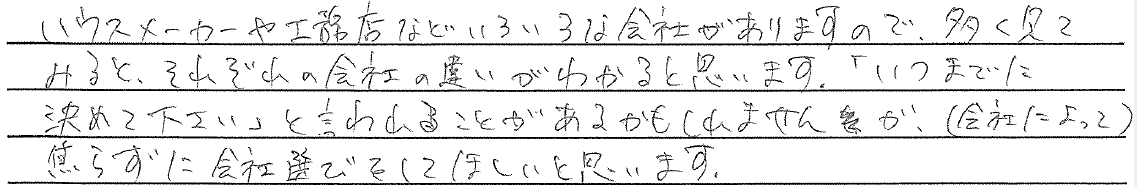 - ハウスメーカーや工務店などいろいろな会社がありますので、多く見てみると、それぞれの会社の違いがわかると思います。「いつまでに決めてください」と言われることがあるかもしれませんが、(会社によって)焦らずに会社選びをしてほしいと思います。