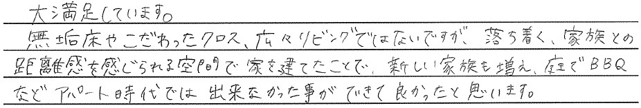 大満足しています。 無垢床やこだわったクロス、広々リビングではないですが、落ち着く、家族との距離感を感じられる空間で家を建てたことで、新しい家族も増え、庭でBBQなど、アパート時代では出来なかった事が出来て良かったと思います。