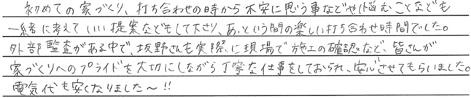 初めての家づくり、打ち合わせの時から不安に思うことなどや、悩むことなども一緒に考えていい提案などもしてくださり、あっという間の楽しい打ち合わせ時間でした。 外部監査がある中で、坂野さんも実際に現場で施工の確認など、皆さんが家づくりへのプライドを大切にしながら丁寧な仕事をしておられ、安心させてもらいました。 電気代も安くなりました~!!