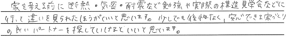 家を考える前に、断熱・気密・耐震など、勉強や実際の構造見学会などに行って違いを見られたほうがいいと思います。 少しでも後悔なく、安心できる家づくりの良いパートナーを探していけるといいと思います。