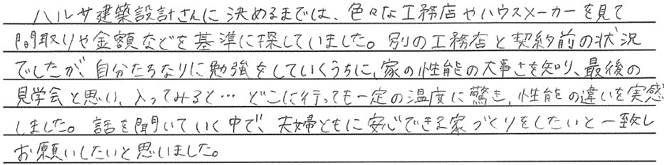 ハルサ建築設計さんに決めるまでは、色々な工務店やハウスメーカーを見て間取りや金額などを基準に探していました。 別の工務店と契約前の状況でしたが、自分たちなりに勉強をしていくうちに、家の性能の大事さを知り、最後の見学会と思い入ってみると・・・どこに行っても一定の温度に驚き、性能の違いを実感しました。 話を聞いていく中で、夫婦ともに安心できる家づくりをしたいと一致しお願いしたいと思いました。